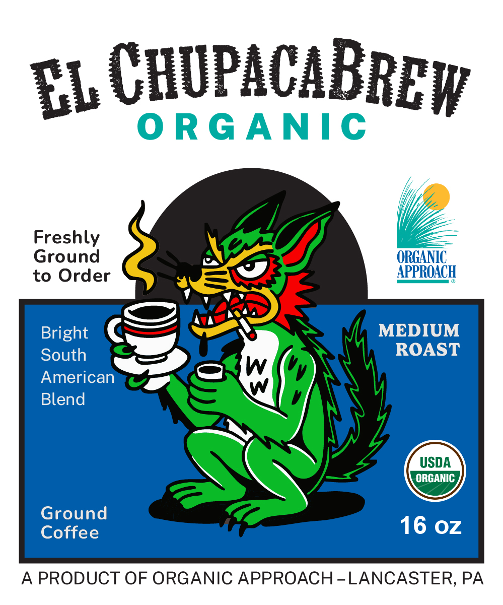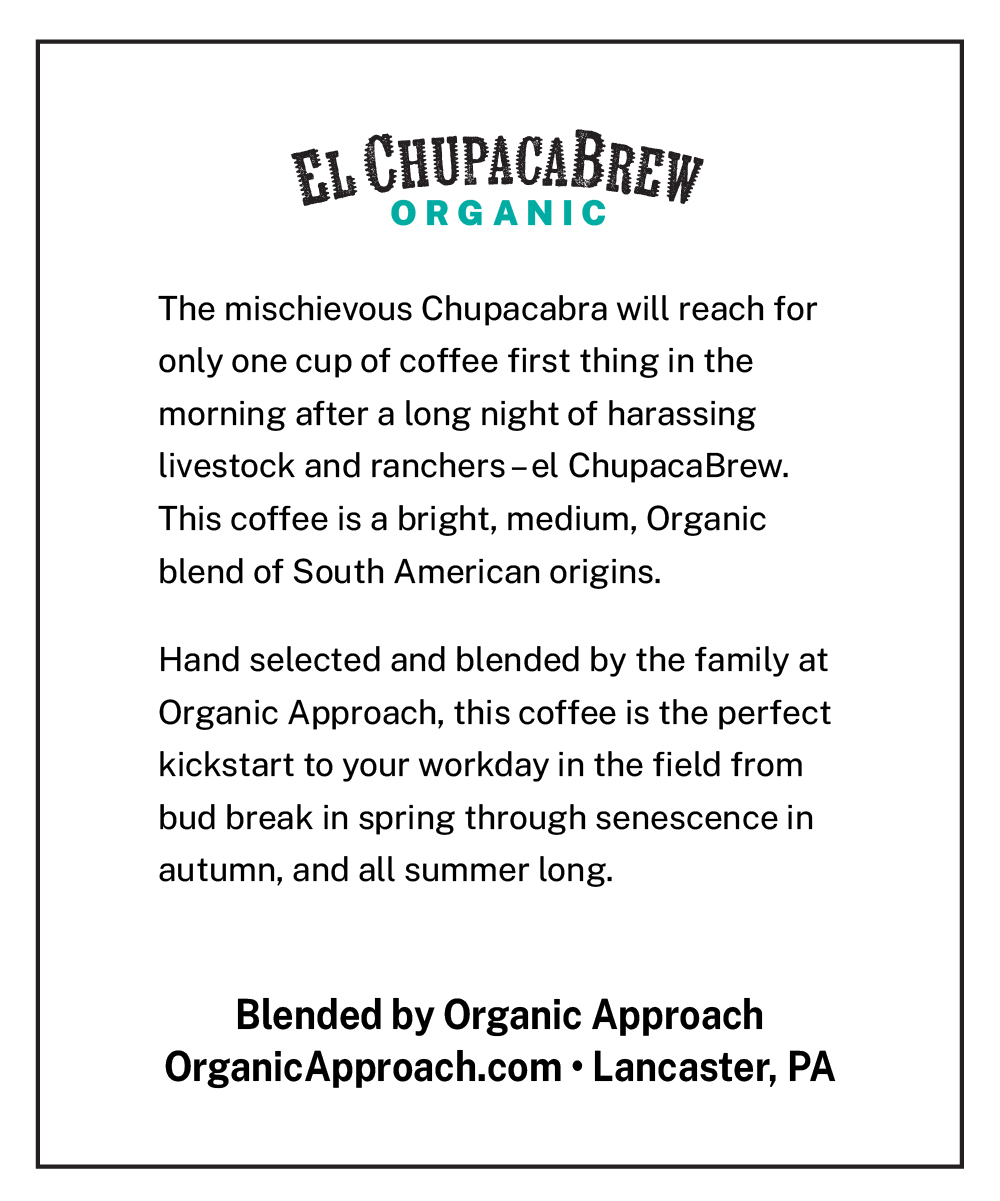 The mischievous Chupacabra will reach for only one cup of coffee first thing in the morning after a long night of harassing livestock and ranchers -El ChupacaBrew. This coffee is a bright, medium roast, Organic blend of South American origins.
